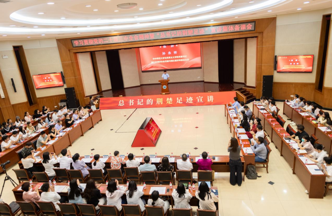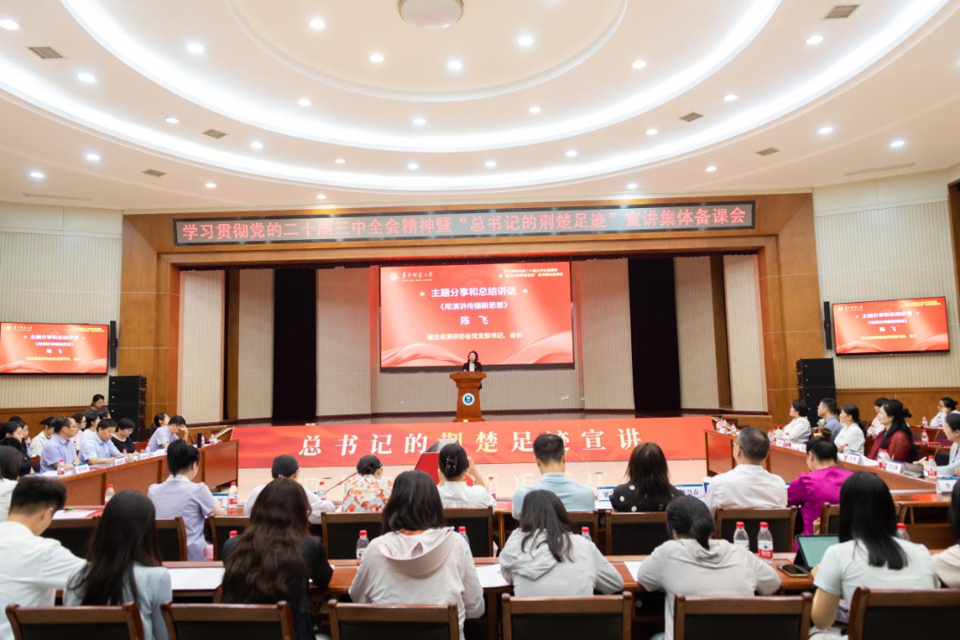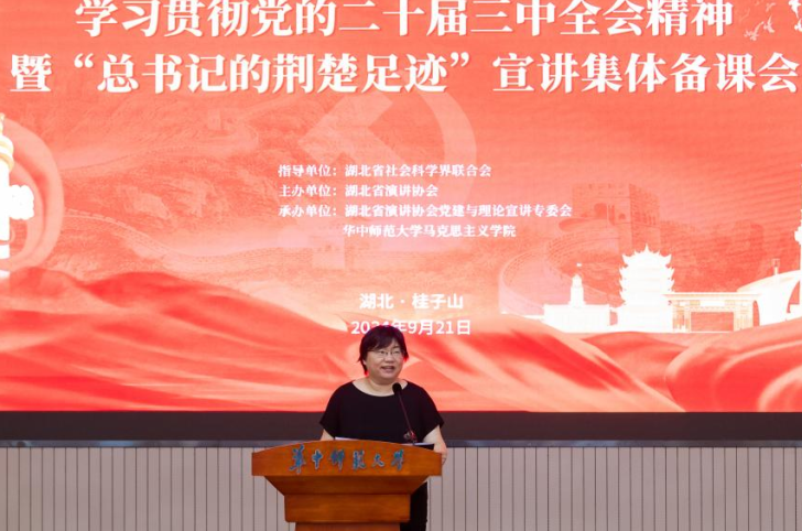 9月21日,学习贯彻党的二十届三中全会精神暨“总书记的荆楚足迹”宣讲集体备课会在华中师范大学科学会堂一楼报告厅举行。华中师范大学马克思主义学院党委副书记、纪委书记,湖北省演讲协会党建与理论宣讲专委会副主任邵莉莉主持会议。