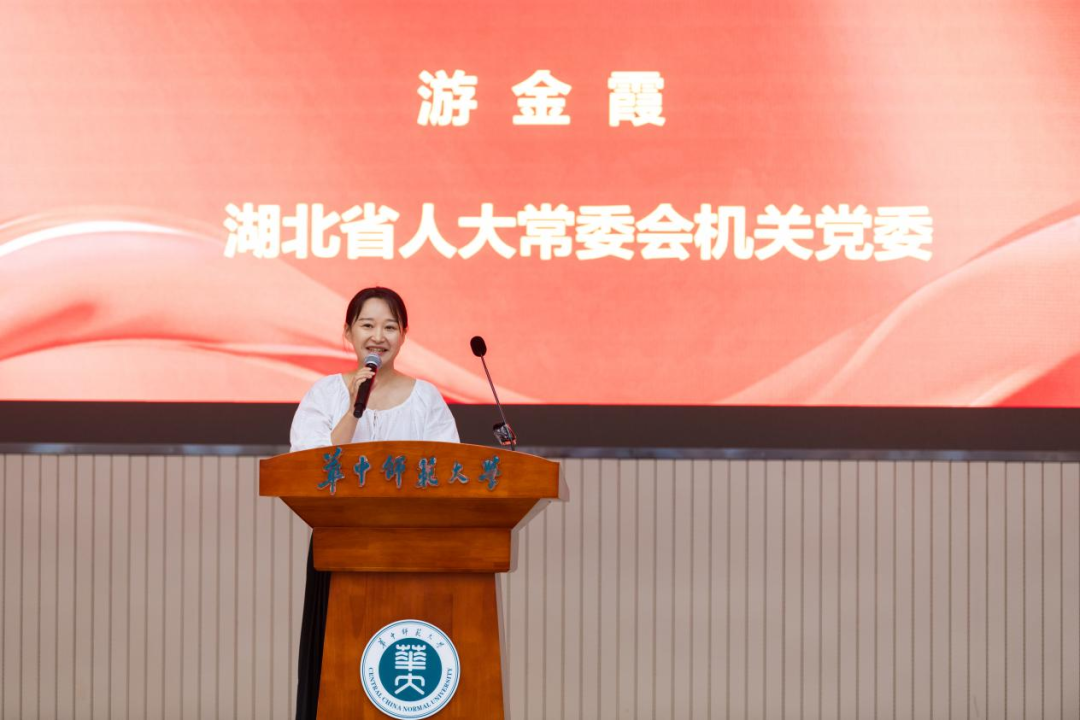 湖北省人大常委会机关党委青年干部、省人大常委会机关“人民代表大会制度在湖北”展示厅青年志愿者讲解队队长游金霞作了《人民至上》主题宣讲。她通过自己在工作岗位上的两个小故事,还原了总书记在湖北考察时体现的人民至上理念。