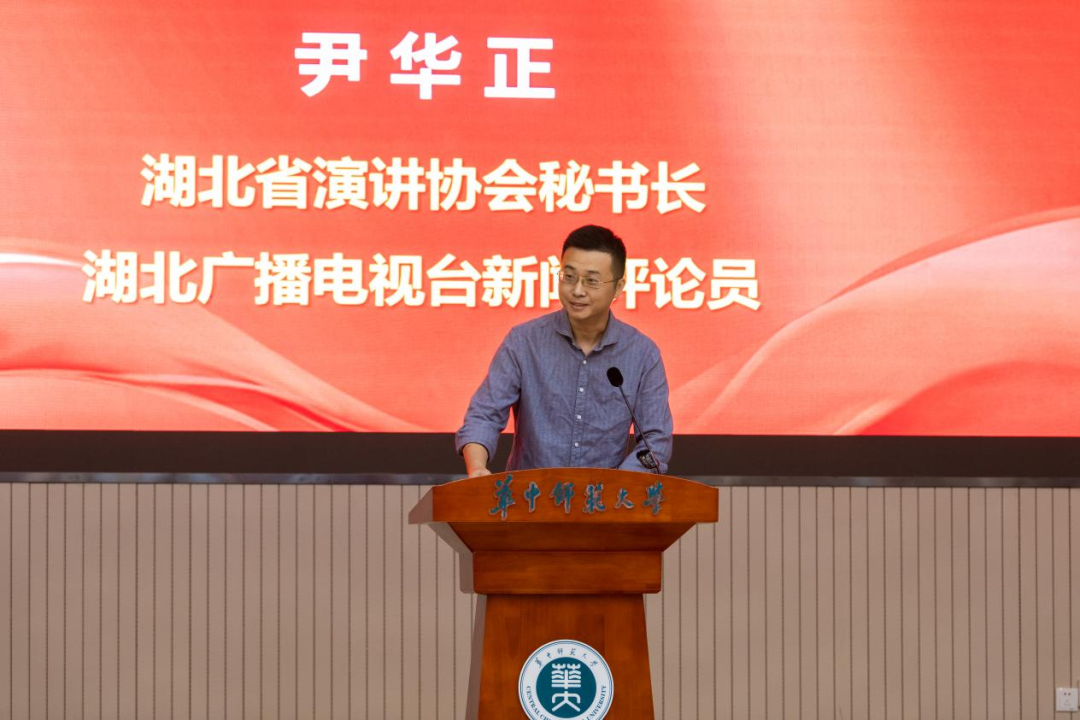 湖北广播电视台新闻评论员、湖北省演讲协会秘书长尹华正作“总书记的荆楚足迹”示范宣讲。他用五张图片将总书记的荆楚足迹串联起来,通过五个总书记的考察故事,讲述了总书记对湖北科技创新、生态保护、粮食安全、人民群众工作等作出的重要指示。