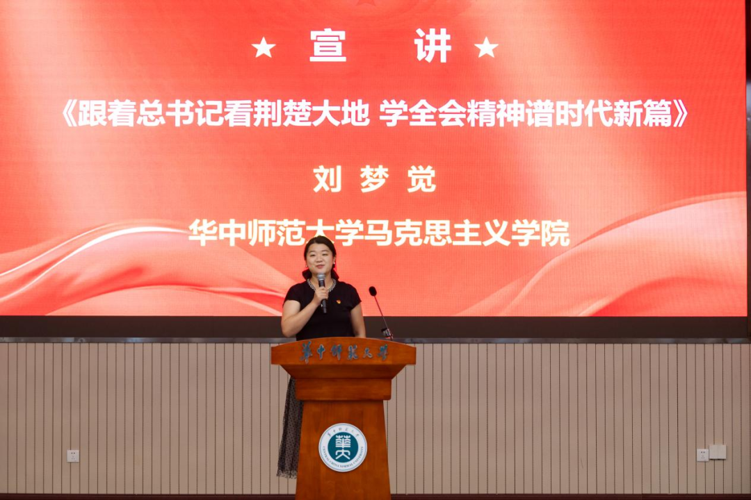 示范宣讲后,会议进入集体备课研讨的第二阶段。华中师范大学马克思主义学院副教授、湖北省五一劳动奖章获得者刘梦觉作了《跟着总书记看荆楚大地,学全会精神谱时代新篇》的主题宣讲。她用“科技创新”、“高质量发展”、“人民就是江山”三个关键词讲述了总书记在湖北考察时体现和强调的重要治国理念。