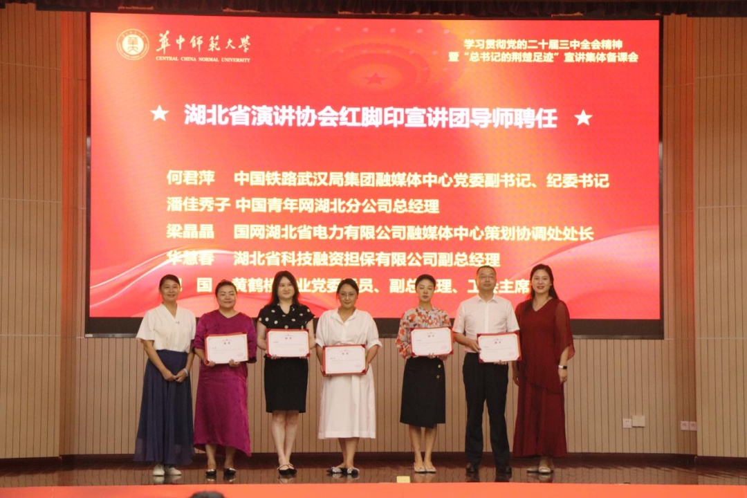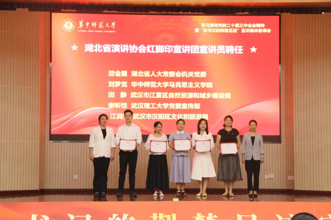 湖北省演讲协会副会长、武汉市公安局经开分局党委委员、政治处主任陈晓波和湖北省演讲协会副会长、江汉大学马克思主义学院党委书记吕洪雁为湖北省演讲协会红脚印宣讲团第三批导师何君萍、潘佳秀子、梁晶晶、华慧春、魏国颁发聘书。