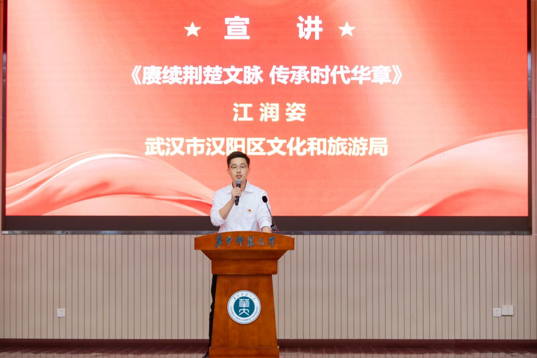 武汉市汉阳区文化和旅游局文旅科副科长江润姿以《赓续荆楚文脉 传承时代华章》为主题进行宣讲,他从党的二十届三中全会提出的“聚焦建设社会主义文化强国”出发,指出荆楚文化的传承与创新对于中国式现代化建设的积极影响,强调青年是培育和创造属于新时代的新文化的主力军。