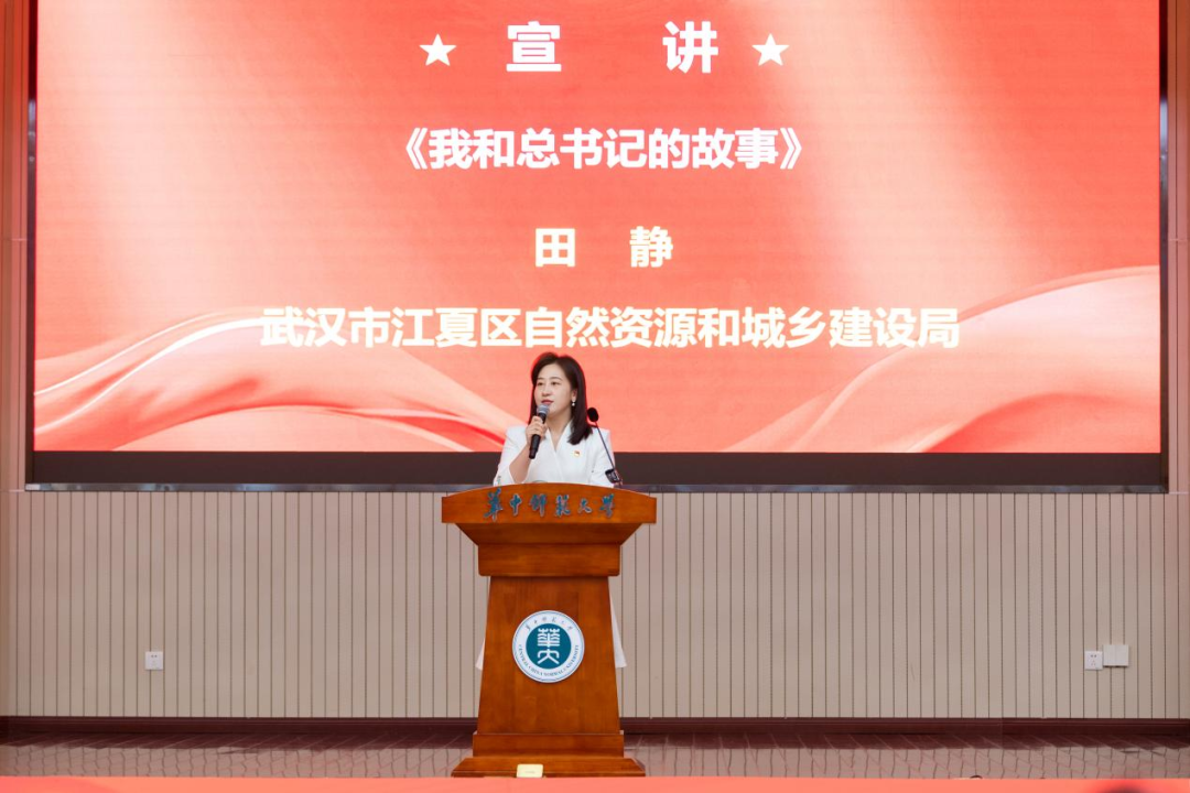 武汉市江夏区自然资源和城乡建设局宣传办、团委负责人田静作了《我和总书记的故事》主题宣讲。她通过讲述自己在工作岗位上偶遇习近平总书记在湖北考察的亲身经历,作为一名普通工作人员得到总书记的握手,让观众从平凡的细节中感受到总书记对人民群众的切身关爱和对国家发展所作的无私奉献。