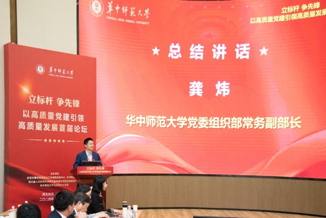 论坛最后,华中师范大学党委组织部常务副部长龚炜向参加论坛的领导、专家表达了感谢,并对此次论坛的丰硕成果进行了全面总结,对未来高校党建持续推进“一融双高”工作进行了展望,提出加强顶层设计,构建以高质量党建引领高质量发展的新格局,夯实基层基础,激发以高质量党建引领高质量发展的新动能,强化党建赋能,塑造以高质量党建引领高质量发展的新优势,并寄希望打造高校党建高质量发展新局面。