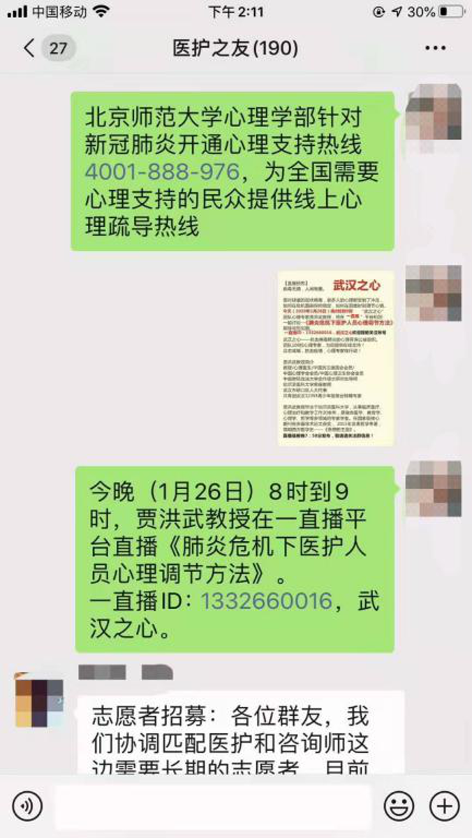 学院师生积极主动参与疫情志愿服务活动,党员同志更是一马当先,彰显“马院人”的责任与担当。教师党员宋荣教授、平凡副教授于1月25日自发创建志愿服务组织,建立“武汉医护人员专用心理咨询”微信群(后改名为“医护之友”),为武汉市一线医务人员开展情绪疏导和心理支持,进行免费义务心理咨询辅导,为白衣天使送去温暖与关怀。随着我校大学生心理健康中心专家余海军老师、国家数字化学习工程技术研究中心张婧老师以及我院省级本禹志愿服务团队——知·行·园学生志愿服务团队、同济医院等学生志愿者等积极加入,“医护之友”志愿服务团队成立。团队成员群策群力想办法探索工作模式,搭建专家群、志愿者群、协调群和医护群,各自领取任务清单,做好协调服务工作。除了一对一咨询外,每天筛选有助于医务人员心理疏导的资源,如专业心理支持平台、心理调节视频、舒缓音乐等在群里推送。另外,平凡老师特邀心理服务团队“武汉之心”负责人贾洪武老师,他们积极开设医务人员心理疏导直播活动。目前群里人数将近200人,各项工作收到了医务人员良好的反馈与评价。