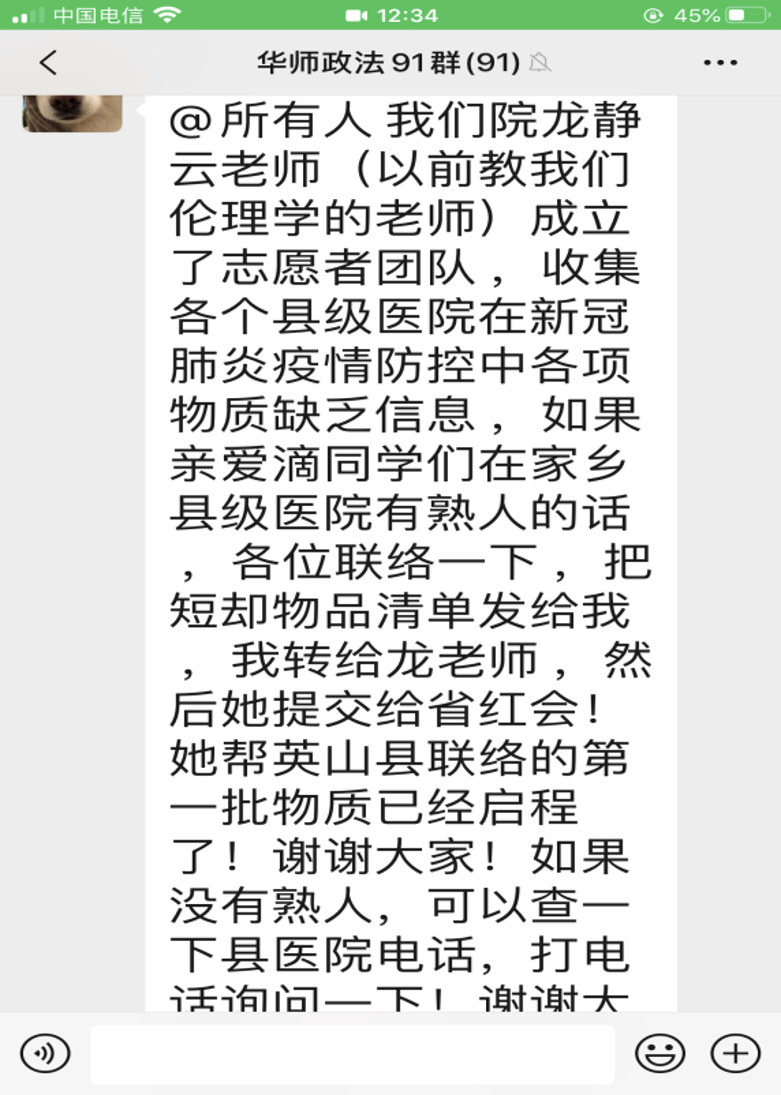 思想道德与法治教育教研部党支部书记、学校“双带头人”党支部书记工作室主持人龙静云教授成立志愿者团队,负责收集各县级医院在本次疫情防控中的各项物资缺乏信息。该志愿者团队已帮助湖北省黄冈市英山县医院筹集第一批物资,正启程发往定点医院。目前,团队仍在积极联系各区县,为县级医院筹备紧缺物资。