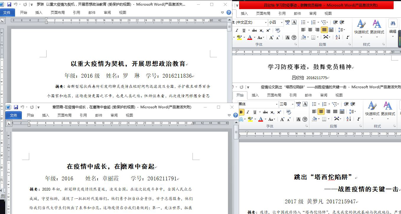 2020年3月21日发布征集令起,恽代英班党支部青年党员们踊跃投稿,内容丰富多样。从分享优秀党员事迹到疫情期间的思想政治教育情况探究,再到疫情期间的自我锻炼,同志们根据自身思考对疫情期间的防控与成长进行了充分的讨论。吕欣怡同学分享了厦门最美逆行护士李秀丽与90后志愿者戴雪娉的抗疫事迹,表示从他们身上学到了勇于奉献的前线精神与脚踏实地的实践精神。