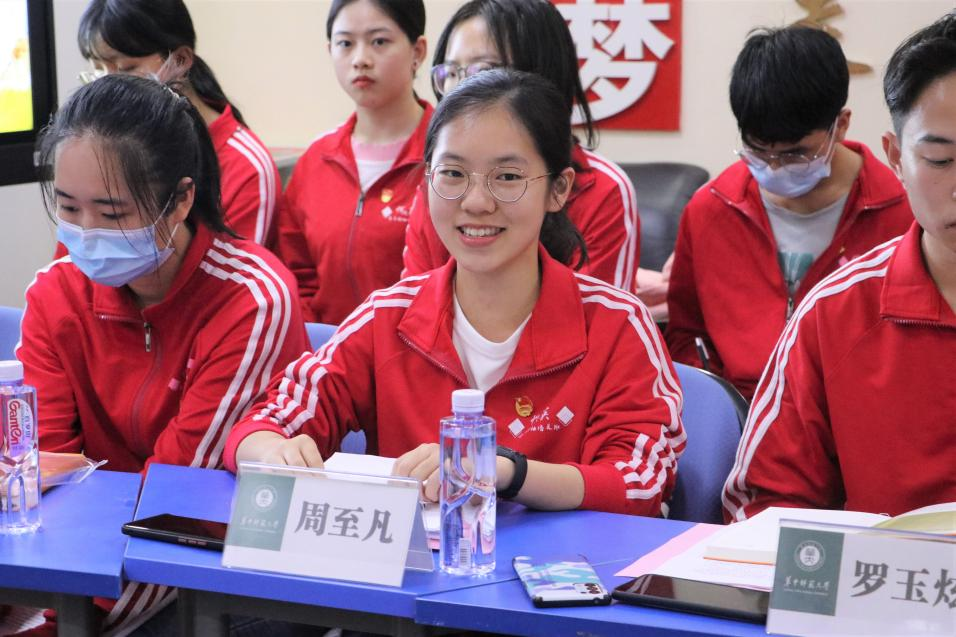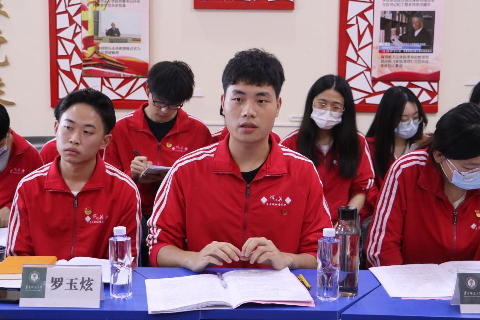 在交流环节,2019级恽代英班成员郭福英分享了自己对于大会重要讲话精神的理解,她认为可以将习近平总书记的讲话大致分为“回顾历史”“总结经验”“寄予期望”三个部分,大会的中心思想主要围绕“中国青年”而展开,与其他会议讲话精神一脉相承,相互贯通,具有延续性。2019级恽代英班成员孙福泽谈到对于思想政治教育专业的认识,认为思政课教师“如何讲好道理”是重中之重,而思政课学生更应该注重实践、培养开阔视野,不断增加自身潜质。2021级恽代英班成员黄天锡认为当代青年是实现第二个百年奋斗目标的主力军,更应该明确使命担当,增强责任感,不管个人在集体或者社会中扮演什么样的角色,都要在各方面做好自己。2021级恽代英班成员罗玉炫从自身专业出发,谈到思政专业的学生应该聚“人气”“地气”“不泄气”于一身,展现自身的担当,注成“大器”。2021级恽代英班成员周至凡谈到“青年的命运是与国家的命运紧密相连的”“青年放飞梦想必须为中国梦而奋斗”“青年成长应当树立正确的理想,坚定正确的道路”,并提出了肩负时代责任担当、引领文明方向、锤炼品格的自我努力方向。