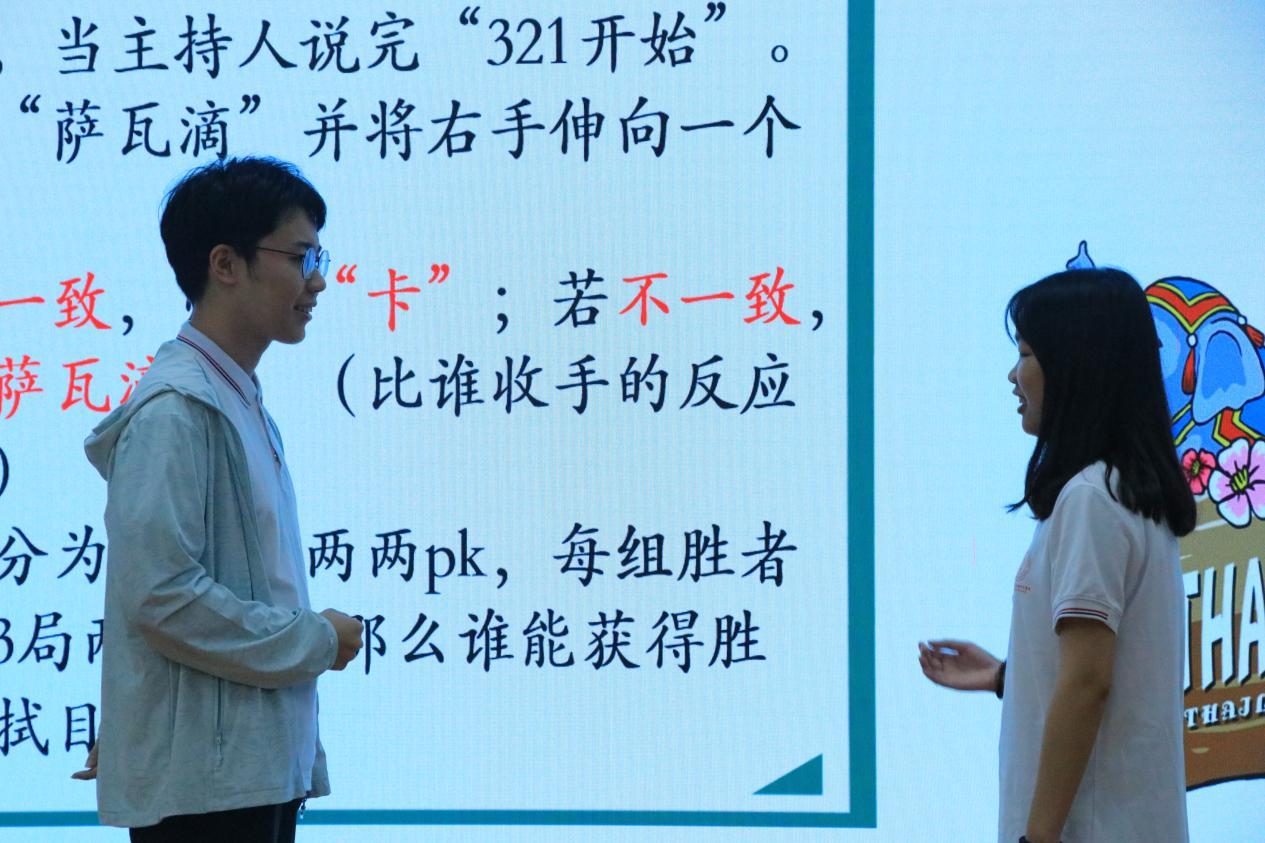 在“抢凳子”游戏中,班级成员热情高涨,积极参与。其中,学术组负责人索婉清全身心投入游戏,摸索规律,抓住时机,取得了第一轮的胜利。在“萨瓦迪卡”游戏中,罗玉铉和童静柔现场演示游戏规则,鼓励班级成员积极尝试新游戏。参与成员全神贯注、集中注意,均取得了优异的成绩。