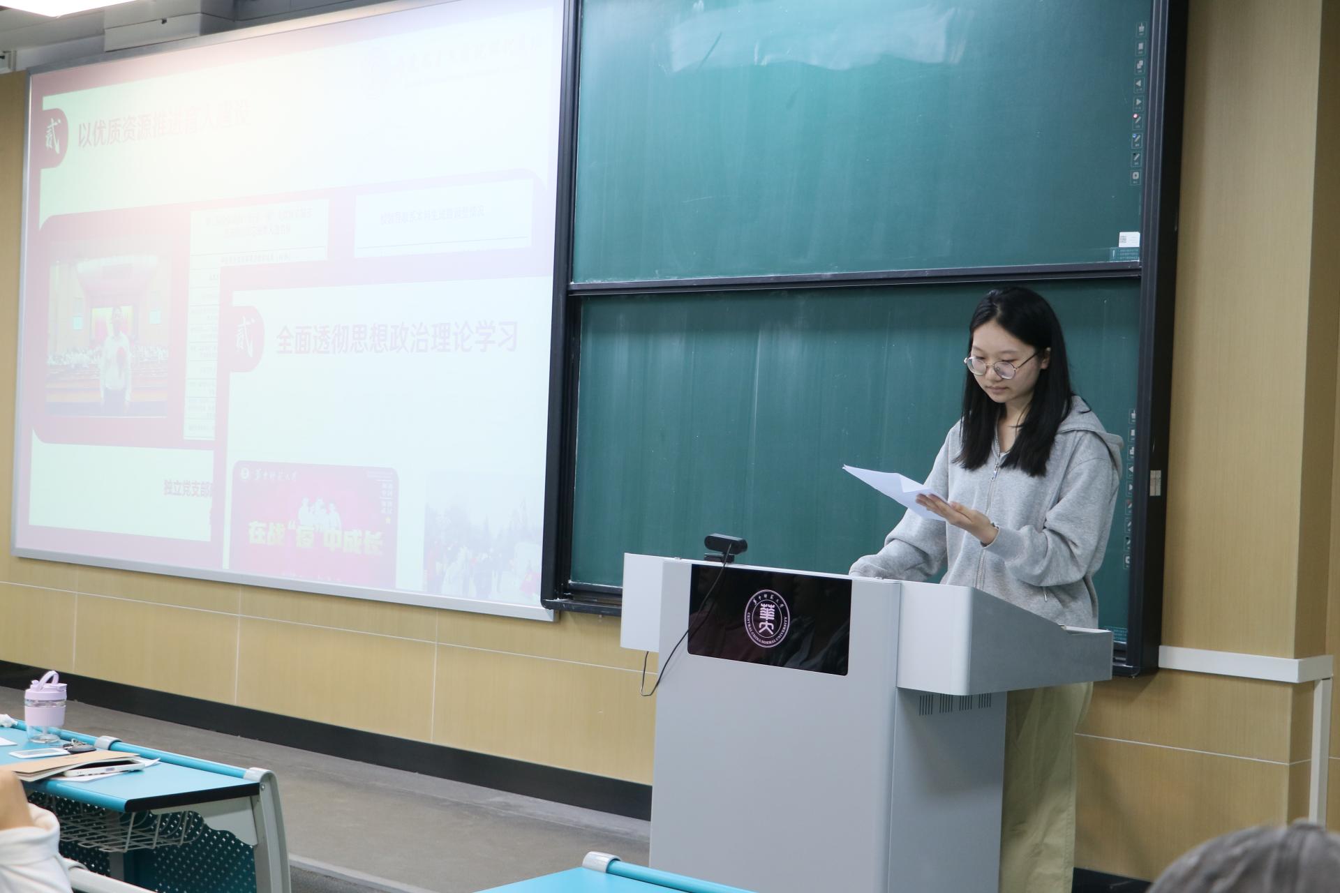 在招新宣讲过程中,邓潇潇、崔粲分别向在场同学介绍恽代英班的组建历史,着重讲解了恽代英班的名称由来及其所传承的恽代英精神。此外,她们还从以优质资源推进育人建设、全面贯彻思想政治理论学习、打造班级先进文化品牌个方面介绍班级文化和班级基本情况,并通过班级活动剪影展示恽代英班形成的“思政名家讲坛”“优师面对面”和“保研考研经验分享会”等系列品牌活动,重点强调班级打造的“1+N”互助帮扶体系,突出班级特色。